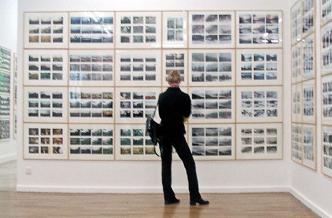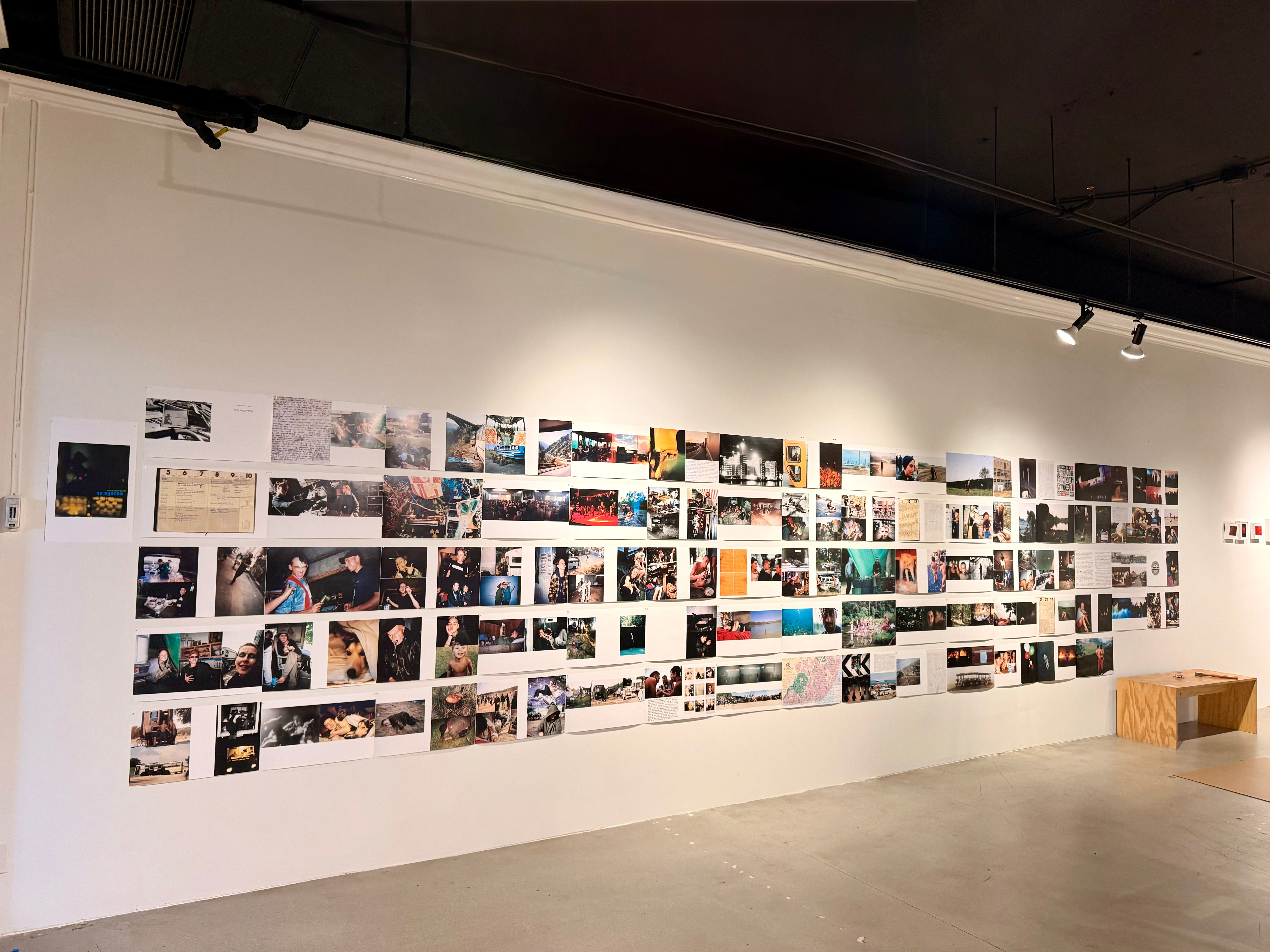 I want to do what I want. Or not at all. Decades expands on the idea of visual accumulation, repetition. Juxtaposes to create a unified front. The show has several grids. Like this reimagined install of Vinca Petersen’s book No System. From the Tate Modern in 2019. It’s ten years of her pictures from the 90s. Petersen traveled around Europe. Following free raves. Photographing it.
